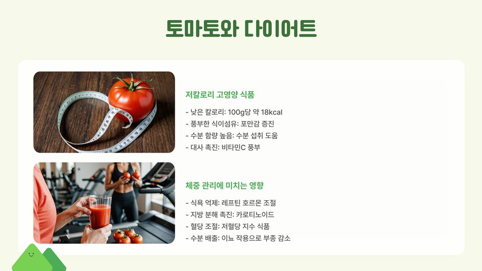 토마토 주스의 또 다른 장점은 체중 관리에 도움을 줄 수 있다는 점입니다. 저칼로리 식품으로, 포만감을 주어 다이어트에 적합합니다. 특히, 아침 식사 대용으로 섭취하면 좋습니다.
