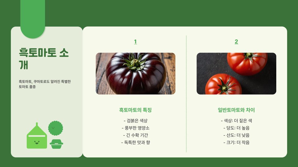 흑토마토는 일반적으로 볼 수 있는 빨간 토마토와는 다른 독특한 색감을 가진 토마토로, 영양가와 건강 효능이 배가된다고 알려져 있습니다. 흑토마토는 특히 항산화 성분이 풍부하여 면역 체계를 더욱 강화하는 데 기여합니다.