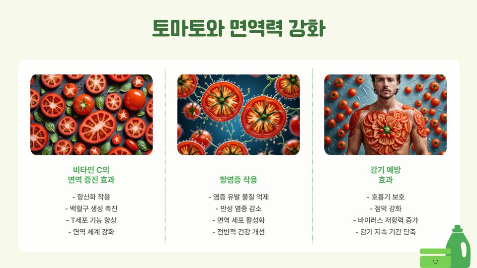 토마토는 비타민 C, 비타민 A, 그리고 칼륨이 풍부하여 면역력을 높이고, 피부 건강을 개선하는 데 도움을 줍니다. 또한, 토마토에 포함된 라이코펜은 강력한 항산화 성분으로, 심혈관 질환과 암 예방에 효과적입니다. 연구에 따르면, 라이코펜은 체내에서 활성산소를 제거하여 세포 손상을 방지합니다.