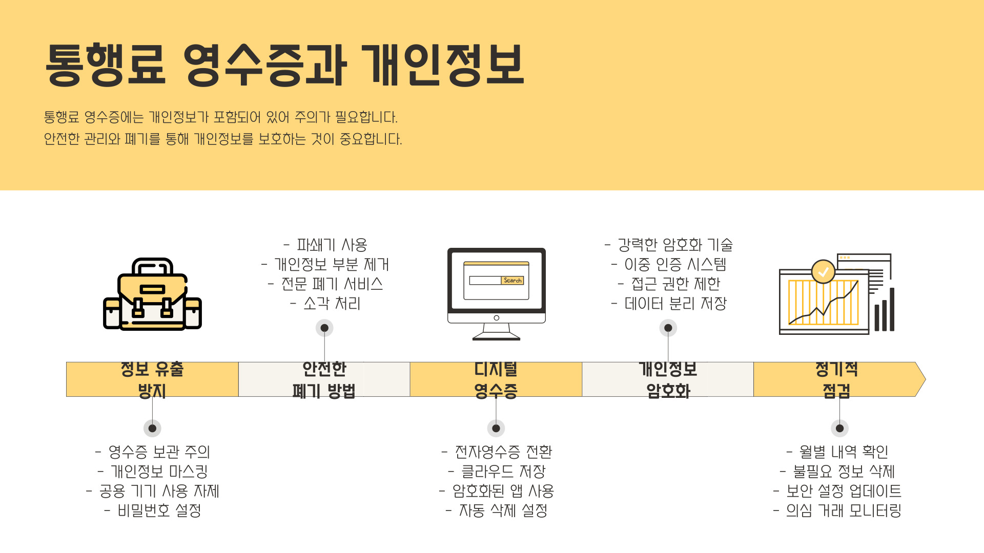 또한, 통행료 영수증에는 개인정보가 포함되어 있을 수 있으므로, 이를 안전하게 보관하는 것도 중요합니다. 불법적으로 정보가 유출될 경우, 개인정보 보호법에 따라 처벌을 받을 수 있습니다. 따라서, 영수증 관리 시 개인 정보 보호에 유의해야 합니다.