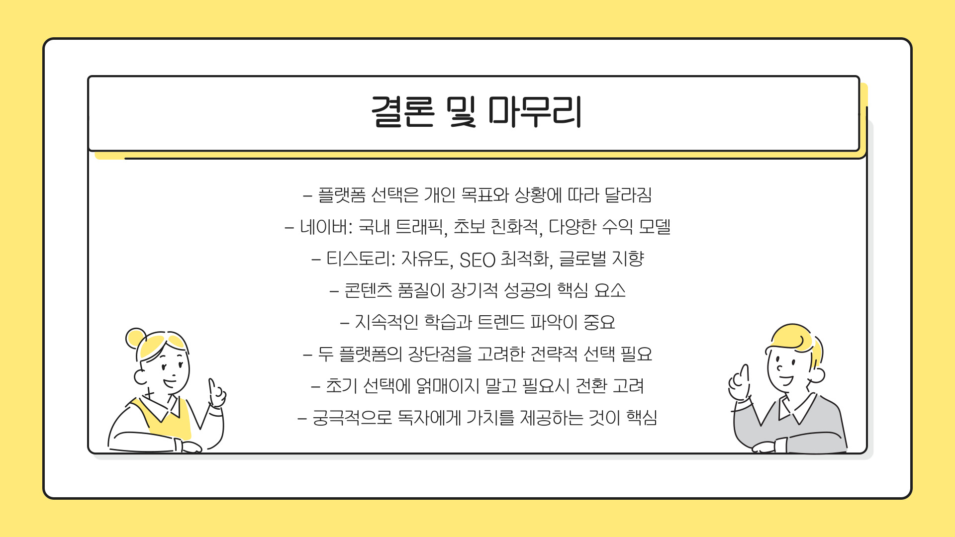 결론적으로, 티스토리 애드센스와 블로그 애드센스는 각각의 장단점이 있습니다. 수익성을 극대화하기 위해서는 자신의 콘텐츠 스타일과 목표에 맞는 플랫폼을 선택하는 것이 중요합니다. 깊이 있는 콘텐츠를 원한다면 티스토리를, 빠른 시작과 접근성을 원한다면 블로그를 선택하는 것이 좋습니다.