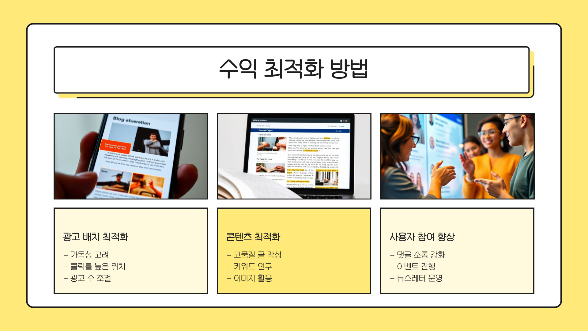 수익성을 극대화하기 위해서는 블로그 애드센스를 운영하는 블로거가 독창적이고 유익한 콘텐츠를 지속적으로 생산해야 합니다. 결국, 방문자 수와 광고 클릭률이 수익에 직접적인 영향을 미치기 때문입니다.