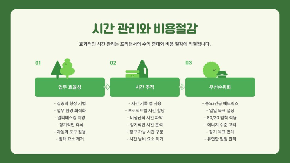 또한, 프리랜서의 경우에 고정 비용을 줄이는 것이 필수적입니다. 예를 들어, 사무실 임대료나 불필요한 구독 서비스를 중지는 필요 경비를 절감할 수 있는 좋은 방법입니다. 더하여, 프로젝트 관리를 효율적으로 수행하면 새로운 기회를 창출하고, 소득을 매달 증가시키는 결과를 가져올 수 있습니다.