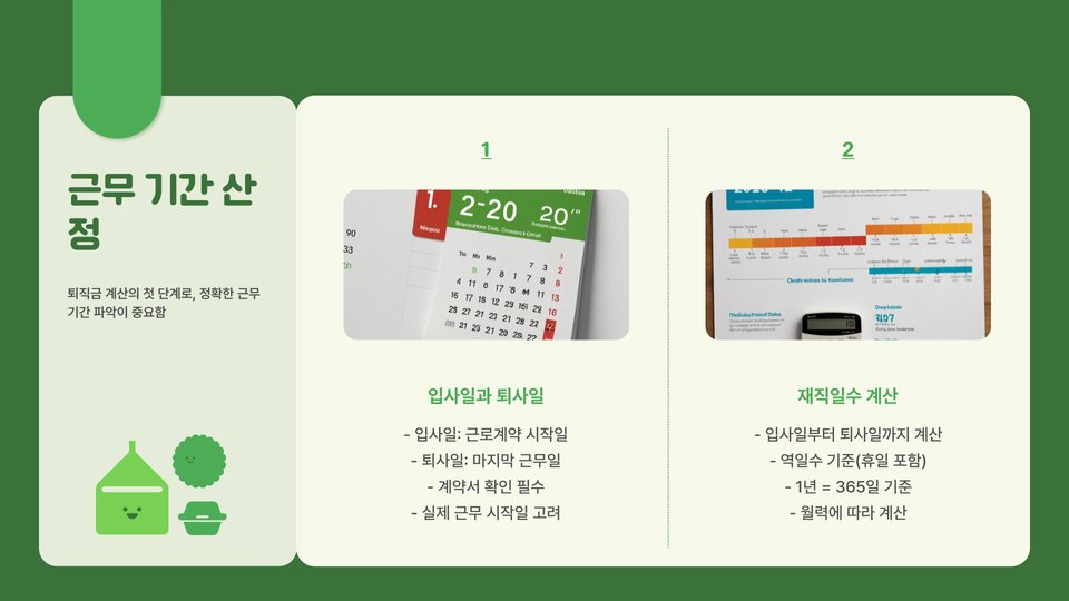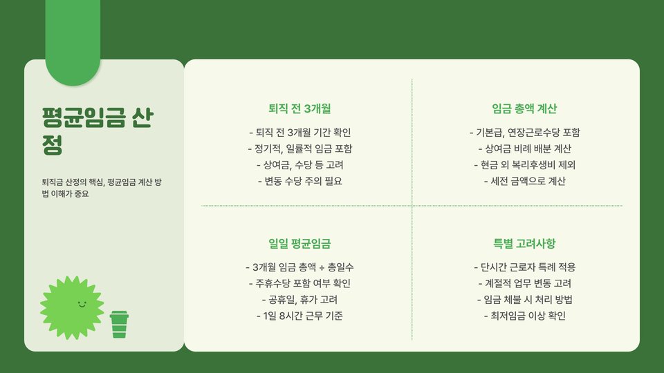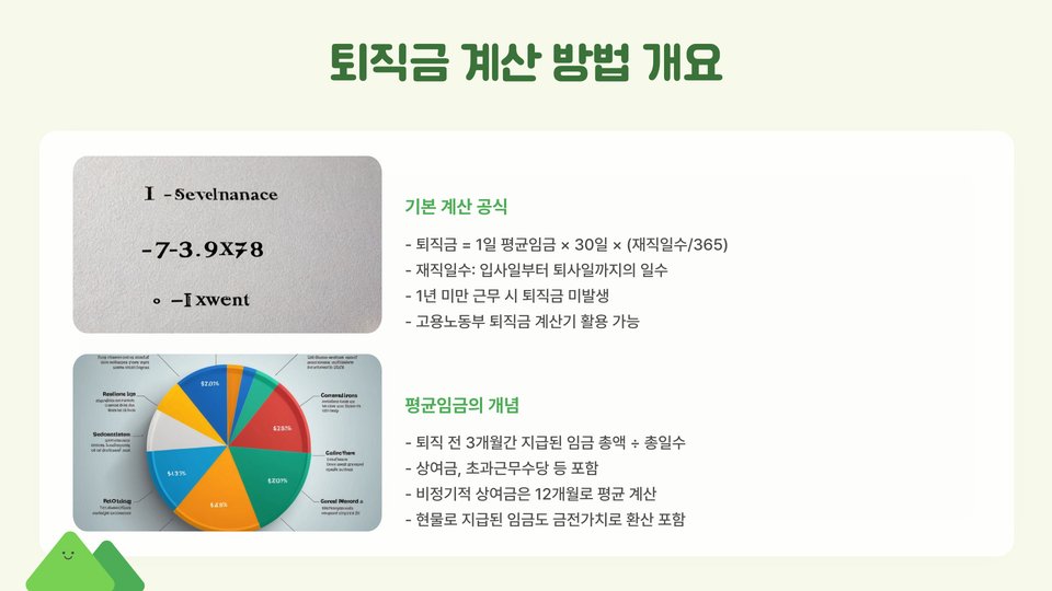 - 퇴직금 계산은 평균 수입과 근속 연수에 기반