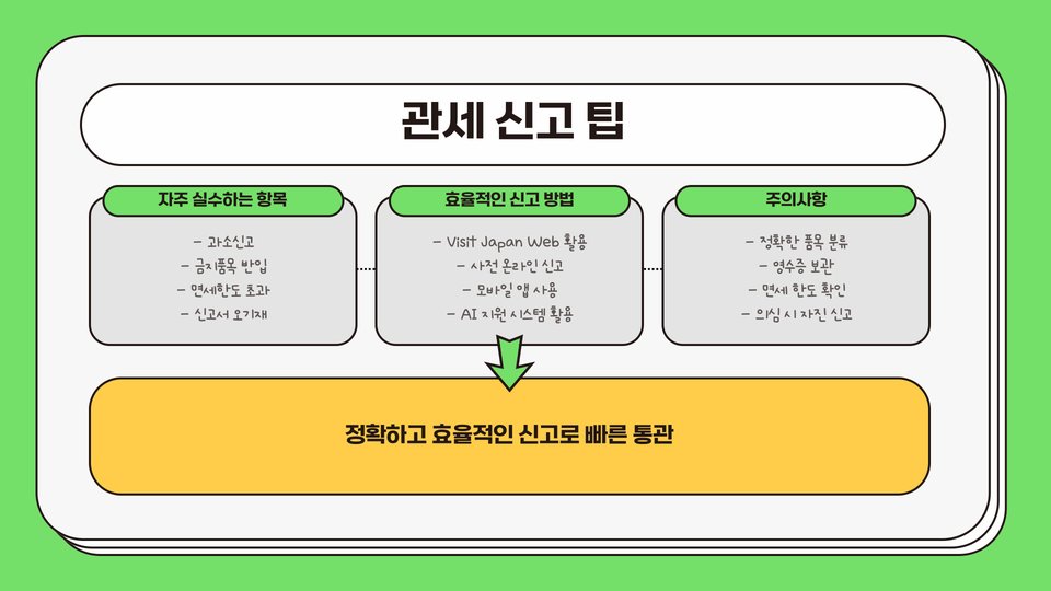 이와 같은 정보들을 바탕으로 2025년 일본 관세 신고에 대비하는 것은 매우 중요합니다. 기업이나 개인 모두가 철저한 준비를 통해 이 과정을 원활하게 진행할 수 있을 것입니다.