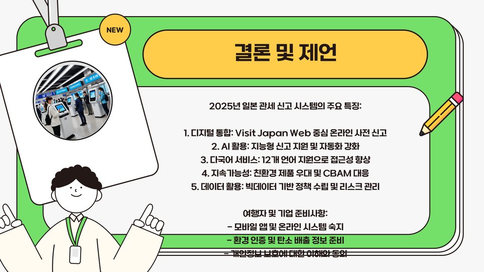 이와 같은 정보들을 바탕으로 2025년 일본 관세 신고에 대비하는 것은 매우 중요합니다. 기업이나 개인 모두가 철저한 준비를 통해 이 과정을 원활하게 진행할 수 있을 것입니다.