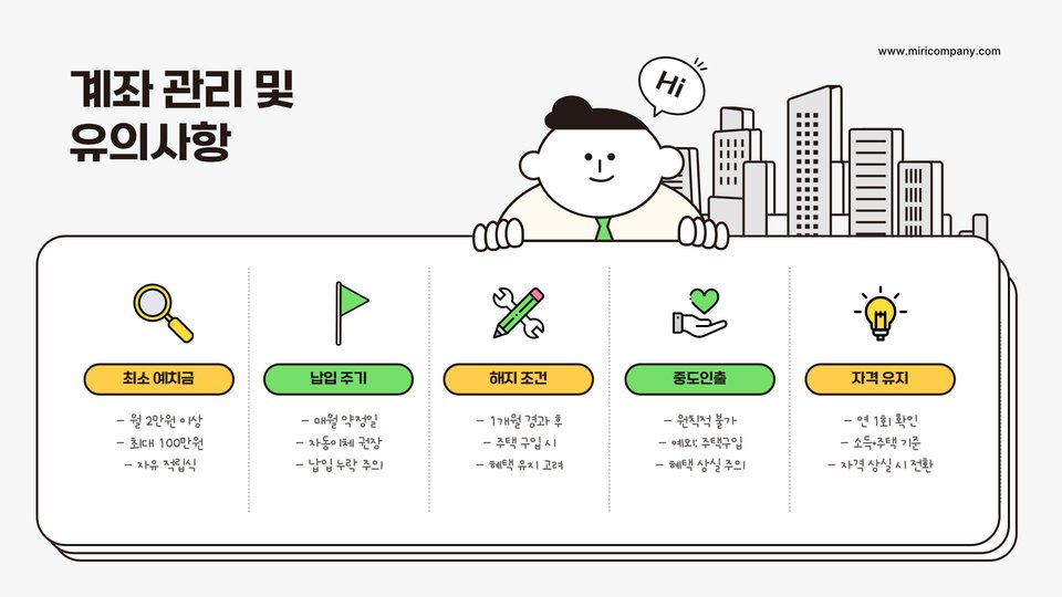 청약통장은 단순히 가입하는 것에서 그치지 않고, 지속적인 관리가 필요합니다. 예를 들어, 주기적으로 청약 점수와 자산 상태를 확인하여 필요 시 납입금이나 통장 종류를 조정해야 합니다. 이를 통해 최적의 청약 기회를 놓치지 않도록 해야 합니다.