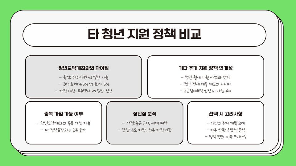 청년주택드림청약통장은 다른 금융 상품과 비교했을 때 주택 구매를 위한 특화된 상품입니다. 예를 들어, 일반 예금 상품이나 적금 상품은 비교적 낮은 이자율을 제공하지만, 청약통장은 주택 구매 시 우선권과 세제 혜택을 제공합니다. 이 때문에 주택 구매를 계획하고 있는 청년들에게 더욱 유리한 선택이 될 수 있습니다.
