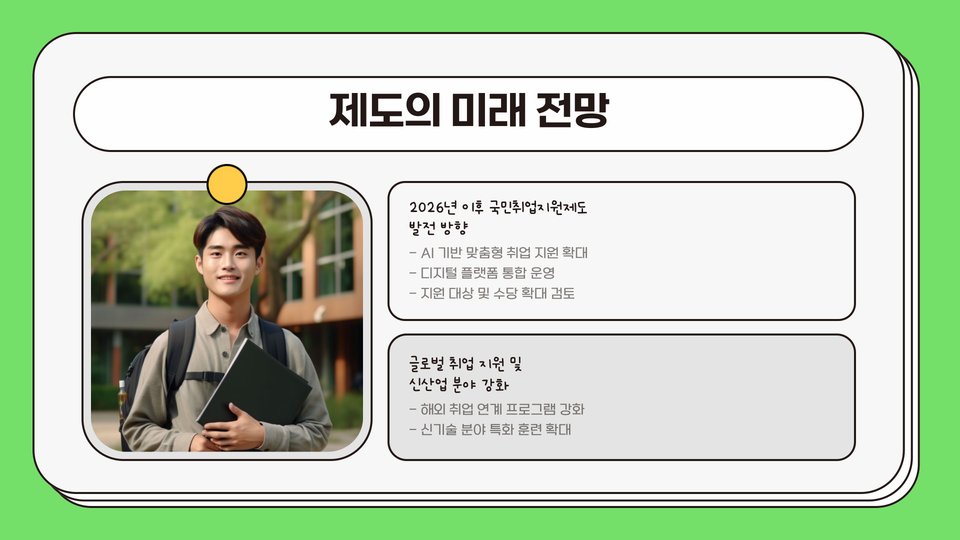 2025년에는 국민취업지원제도가 더욱 발전할 예정입니다. 정부는 AI와 빅데이터를 활용하여 구직자와 기업 간의 매칭을 더욱 효율적으로 진행할 계획입니다. 이를 통해 구직자는 더 적합한 일자리를 쉽게 찾을 수 있게 될 것입니다. 또한, 다양한 산업의 변화에 맞춰 직업훈련 프로그램이 지속적으로 업데이트될 예정입니다.