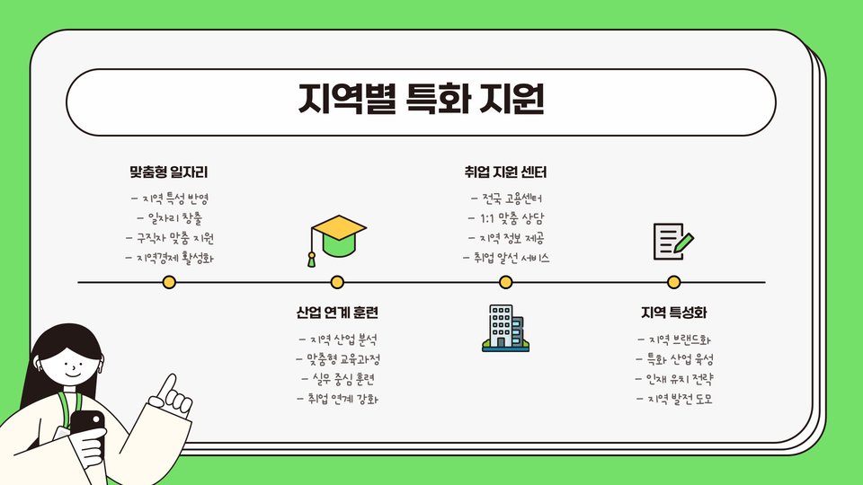 전체적인 목표는 구직자가 필요한 학습과 동시에 일자리를 구하는 데 필요한 다양한 자원을 활용할 수 있도록 지원하는 데 있습니다. 이와 같은 지원을 통해 취업의 성과를 극대화할 수 있습니다.