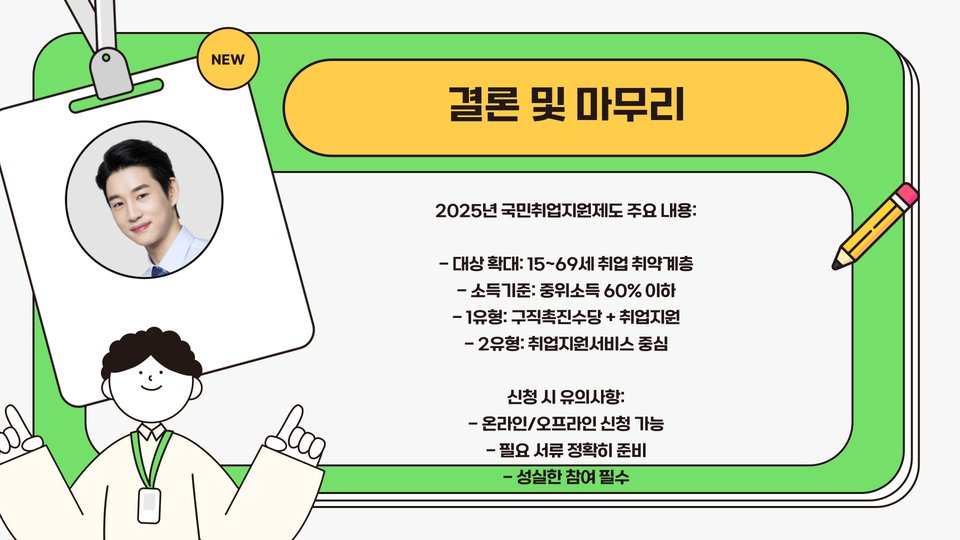 이상으로 2025년 최신 국민취업지원제도의 대상 및 신청 방법에 대해 설명드렸습니다. 이 제도를 통해 많은 사람들에게 새로운 기회가 열리기를 바라며, 적극적인 참여와 준비로 성공적인 취업을 희망합니다.