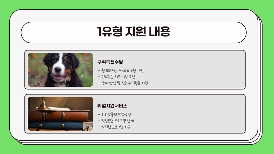 전체적인 목표는 구직자가 필요한 학습과 동시에 일자리를 구하는 데 필요한 다양한 자원을 활용할 수 있도록 지원하는 데 있습니다. 이와 같은 지원을 통해 취업의 성과를 극대화할 수 있습니다.