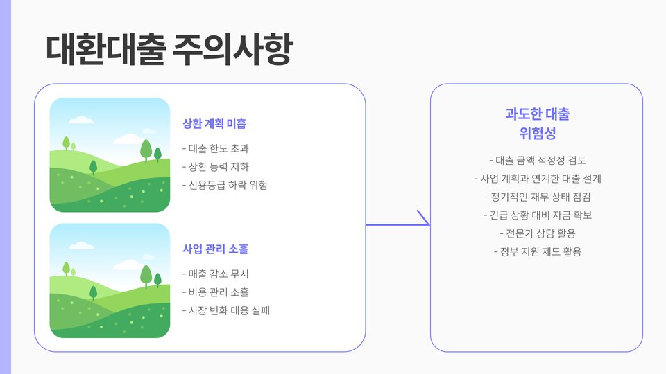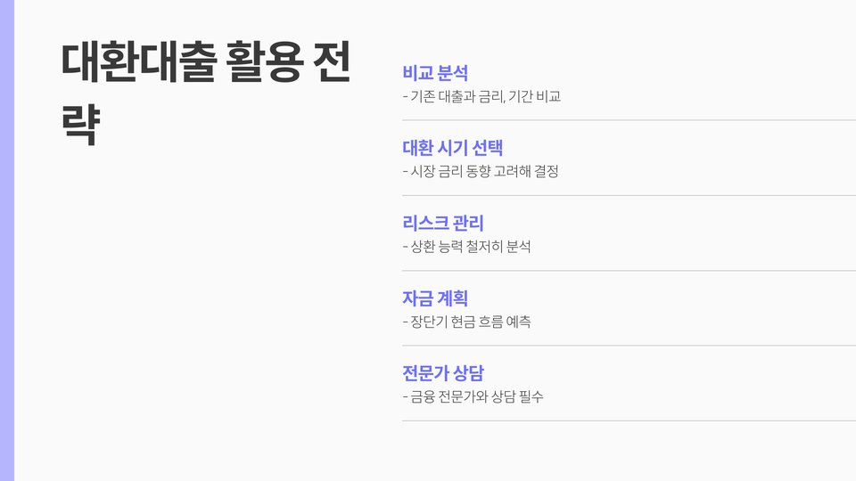 중요: 대환대출을 신청하기 전에 반드시 다양한 금융 기관의 조건을 비교하고, 자신의 사업 모델과 재정 상황에 맞는 최적의 대안을 찾는 것이 중요합니다.