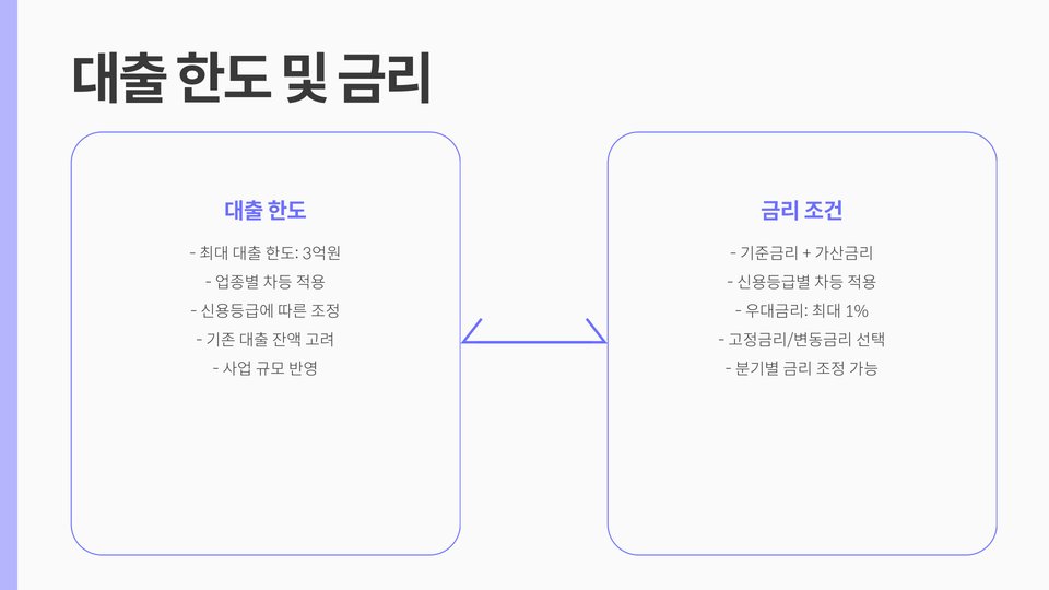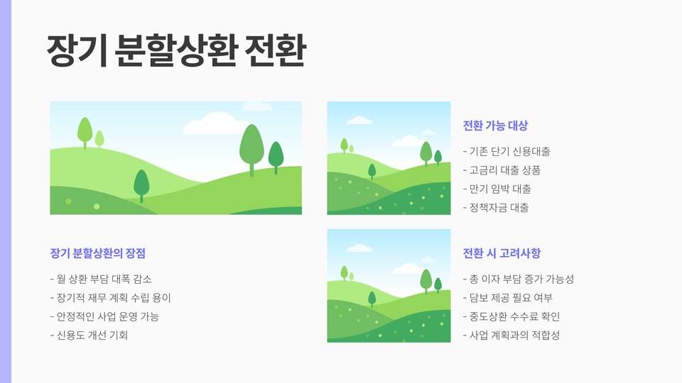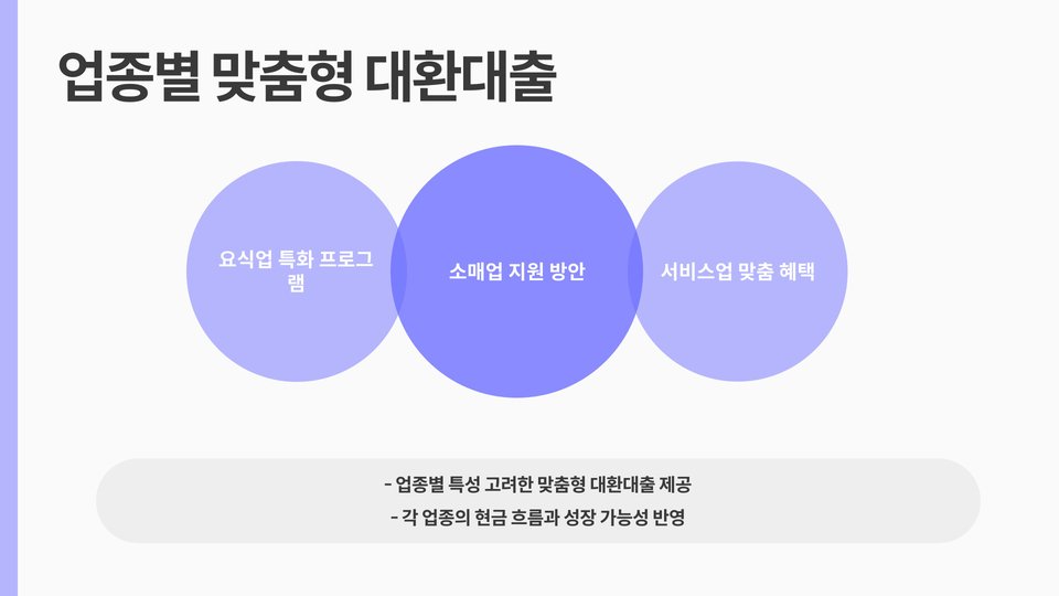 추가적으로, 대환대출이 가능한 기존 대출은 고금리 대출에 한정됩니다. 따라서, 저금리 대출은 대환대출 대상이 아닙니다. 소상공인들은 이를 통해 원활한 자금 조달과 운영의 연속성을 확보할 수 있습니다. 대출 한도는 사업 규모와 신용도에 따라 다르게 적용됩니다.