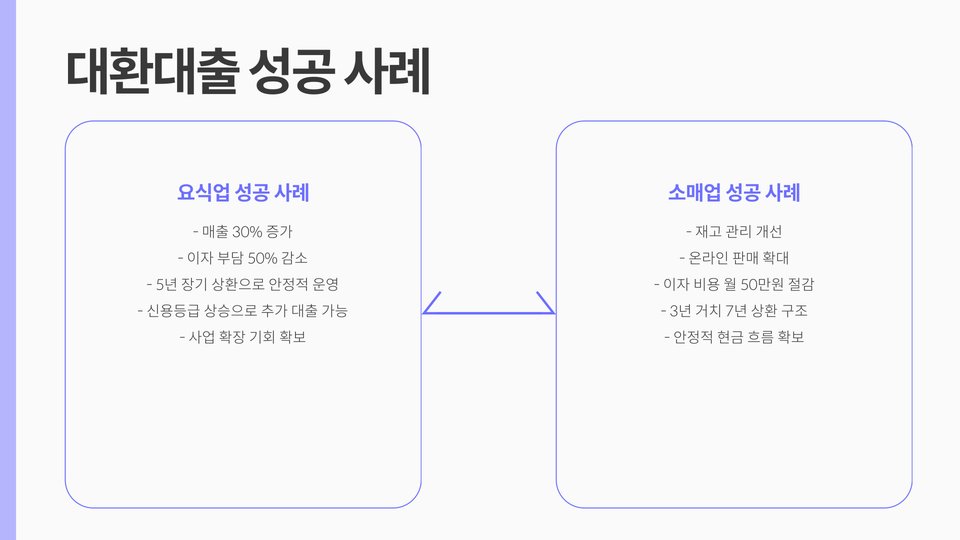 또한, 대환대출은 상환 기간 연장의 혜택도 제공합니다. 기존 대출의 상환 기간이 짧았던 경우, 새로운 대출로 인해 상환 기간이 늘어나면 매달 상환해야 하는 금액이 줄어들어 사업 운영에 한층 여유를 갖게 됩니다.
