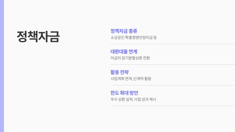 추가적으로, 대환대출이 가능한 기존 대출은 고금리 대출에 한정됩니다. 따라서, 저금리 대출은 대환대출 대상이 아닙니다. 소상공인들은 이를 통해 원활한 자금 조달과 운영의 연속성을 확보할 수 있습니다. 대출 한도는 사업 규모와 신용도에 따라 다르게 적용됩니다.