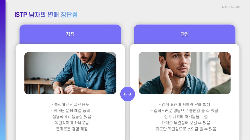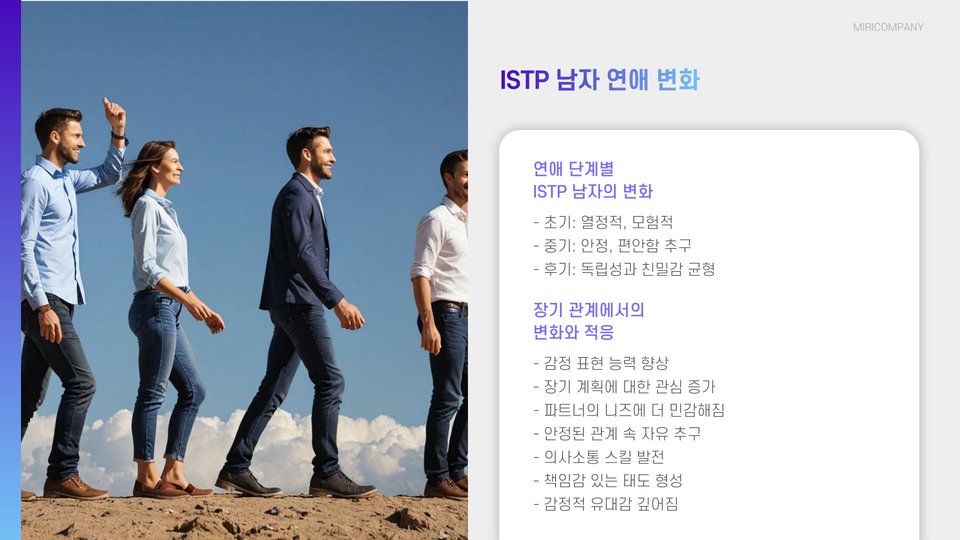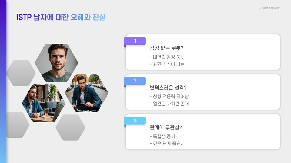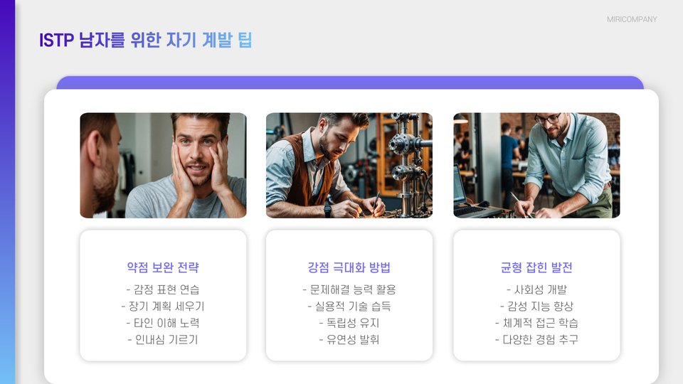 제공된 정보를 바탕으로, ISTP 남자의 성격을 이해하고 그들과의 원활한 관계를 형성하여, 서로에게 긍정적인 영향을 주는 소중한 관계를 만들어 나가시길 바랍니다.