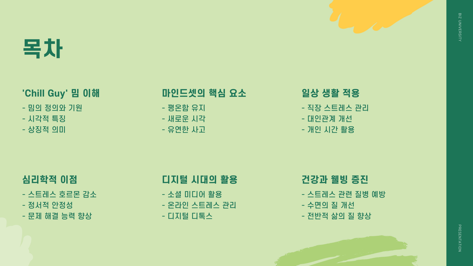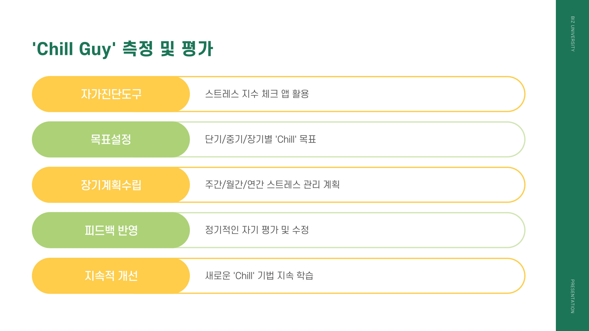 마지막으로, 이러한 방법들을 실천하면서 만나는 작은 성취감은 우리의 마음을 더욱 차분하게 만들어 줄 것입니다. chill guy처럼 여유롭고 긍정적인 태도를 유지하면서 더 행복한 하루하루를 누릴 수 있습니다.