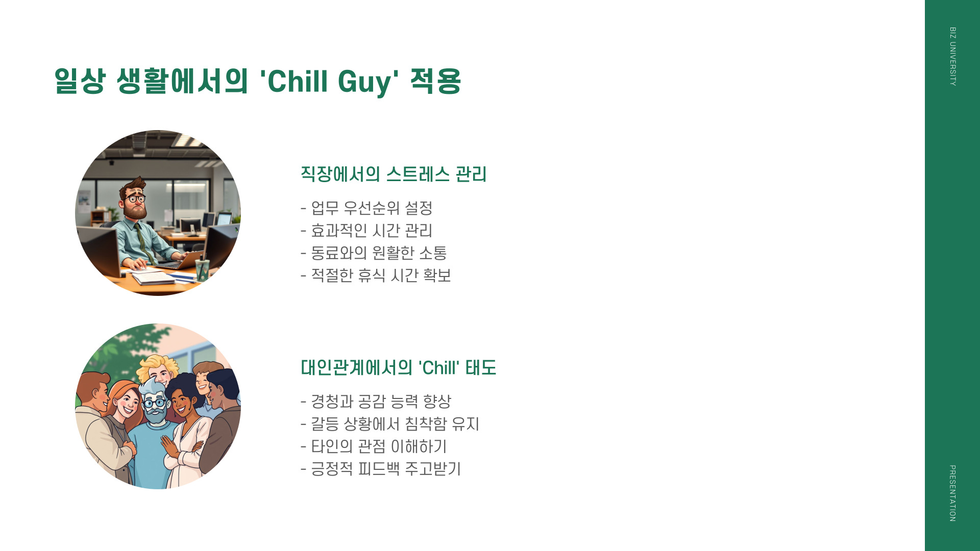 우리는 일상 속에서 chill guy의 마인드를 적용할 수 있습니다. 여유로운 태도로 문제를 바라보면, 스트레스가 줄어들고 해결책을 찾는 데 도움이 됩니다. 예를 들어, 직장에서의 압박을 느낄 때, 상황을 객관적으로 바라보는 것이 중요합니다. “이 문제는 내가 해결할 수 있다”는 믿음을 가지면, 자연스럽게 차분해질 수 있습니다.
