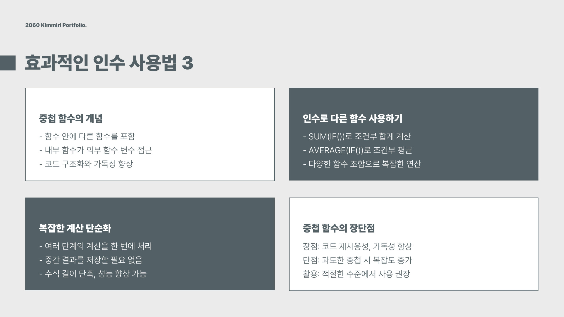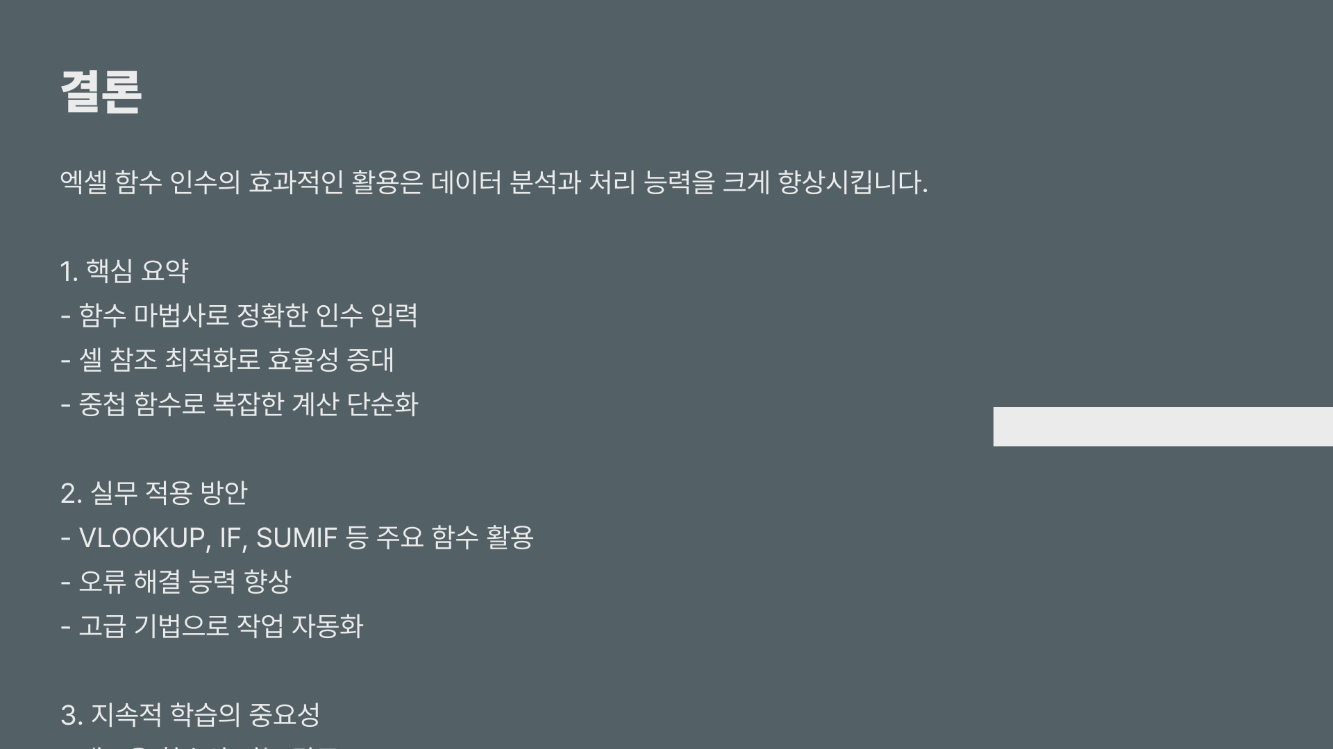 이처럼 엑셀 함수 인수의 활용은 단순한 계산을 넘어 데이터 분석의 효율성을 크게 향상시킬 수 있습니다. 함수 인수를 잘 활용하면 일상 업무에서 시간과 노력을 절약할 수 있습니다.